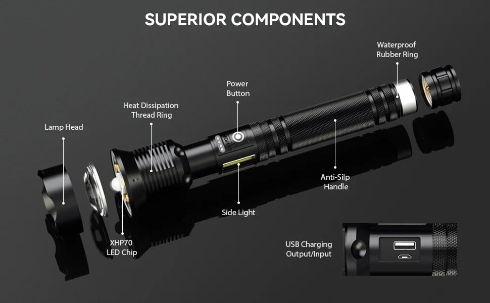 Amazing Illumination: With 6K Lumens, Professional LED flashlight is strong and sturdy.