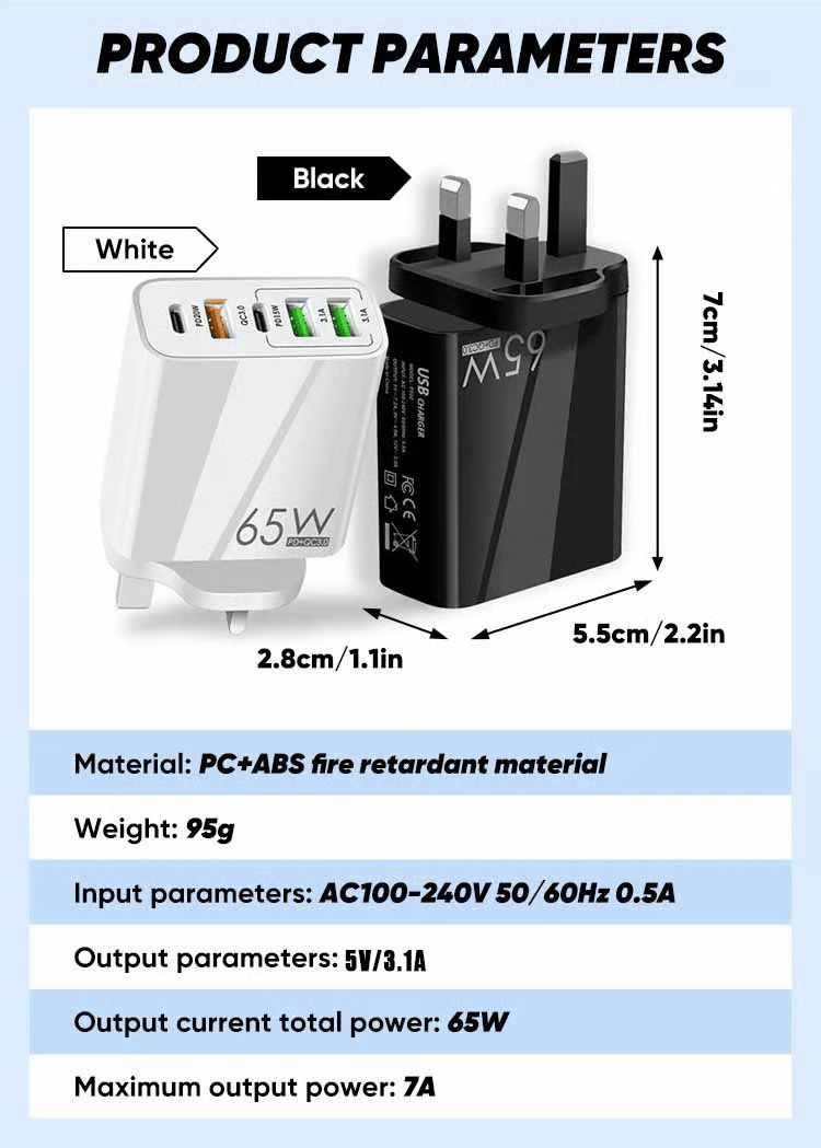 Power multiple devices simultaneously with this compact and powerful 65W Multi-Port Fast Wall Charger, designed for the UK market.
