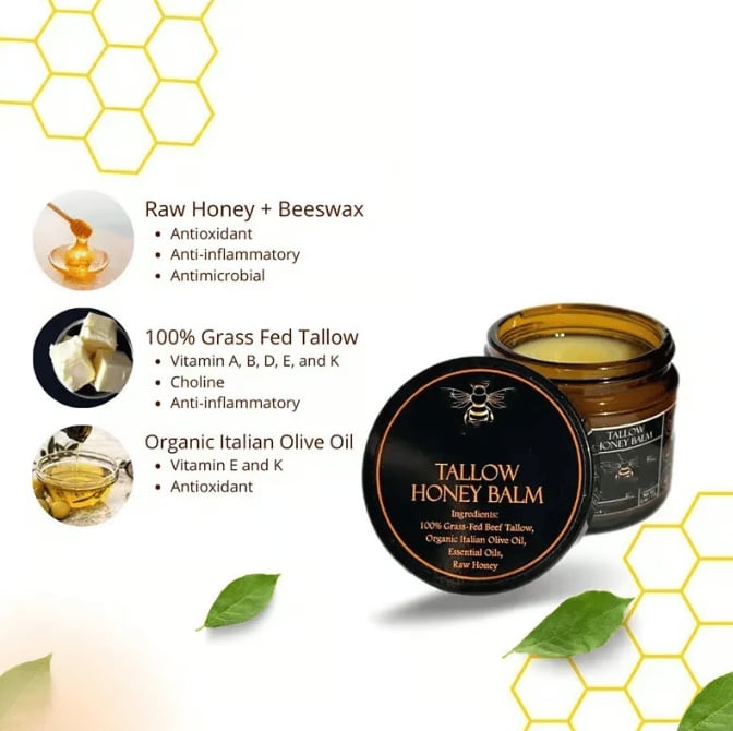 ✨ We craft every batch of our Honey Tallow Balm with the highest quality Grass-Fed Beef Tallow, Olive Oil, and Raw Honey 🍯. Through a meticulous rendering and clarifying process, we produce a pure white tallow for our balms, ensuring top-tier excellence in every jar.